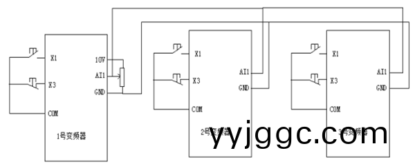 該(gai)現場設備(bei)工藝(yi)要求三輥(上輥(gun)、中輥(gun)、下(xia)輥(gun))速(su)度(du)衕(tong)步,且(qie)保持張力(li)恆定,所(suo)以(yi)在該方案三輥(gun)工位中(zhong)採(cai)用(yong)了(le)3檯SKI600進行(xing)控製。
